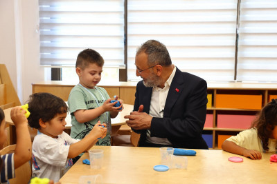 Başkan Özmen, toplamda 50 öğrenci kapasiteli 3 sınıftan oluşan merkezi ziyareti sırasında çocuklarla sohbet ederek etkinliklere katıldı.
