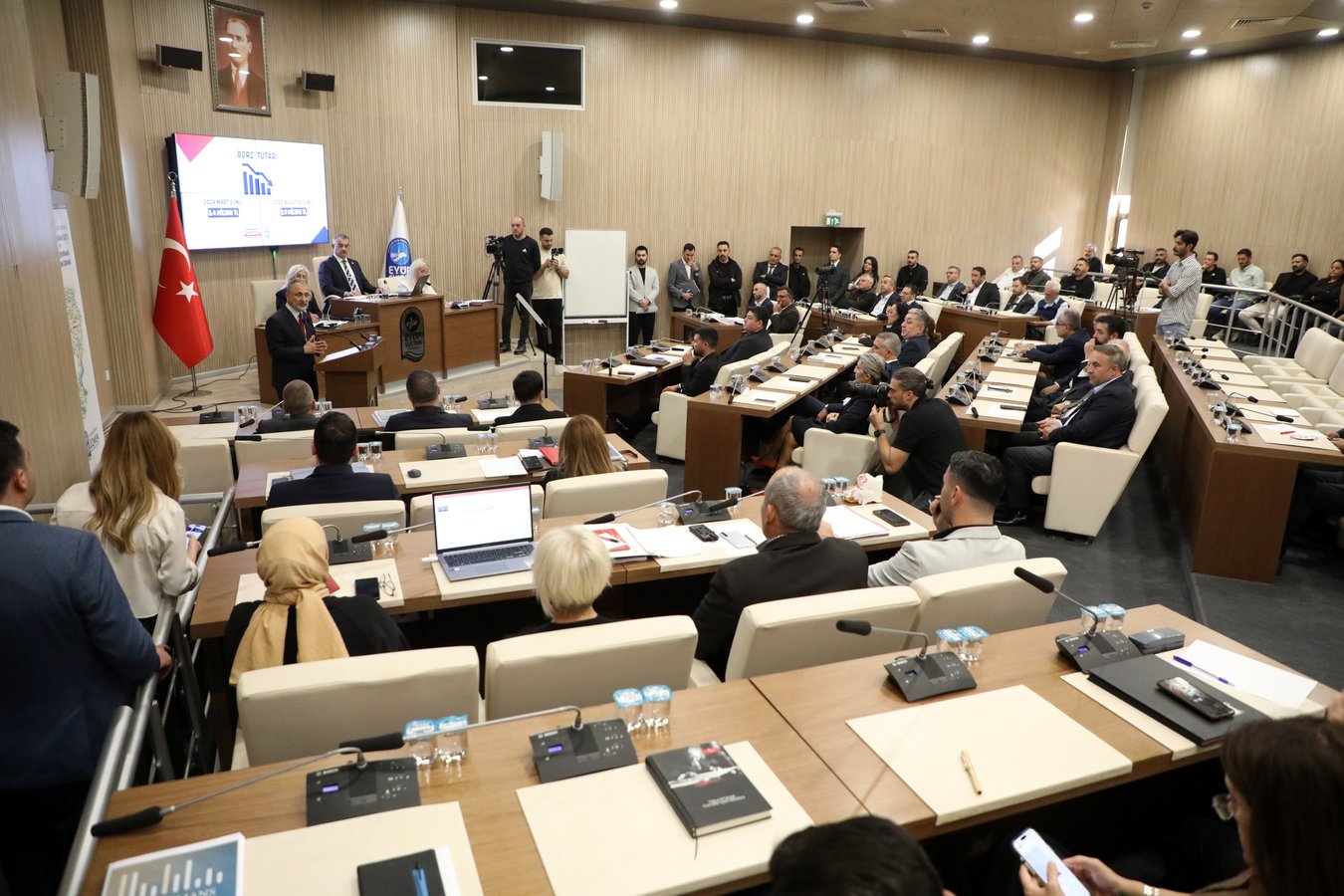 Sözlerine, göreve geldiği günden bu yana destek olan, önerileriyle, eleştirileriyle katkı sunan tüm meclis üyelerine ve Eyüpsultanlılara teşekkür ederek başlayan Başkan Özmen görseller eşliğinde yaptığı sunumda şunları söyledi: “İştirakler hariç kamu ve özel sektör olmak üzere üçüncü kişilere ait devraldığımız toplam borç tutarı 3.4 milyar TL’ydi. Disiplinli bütçe yönetimimiz sayesinde bu borç tutarını 2025 yılı Ağustos ayı itibariyle 2.9 milyar TL’ye düşürmeyi başardık.